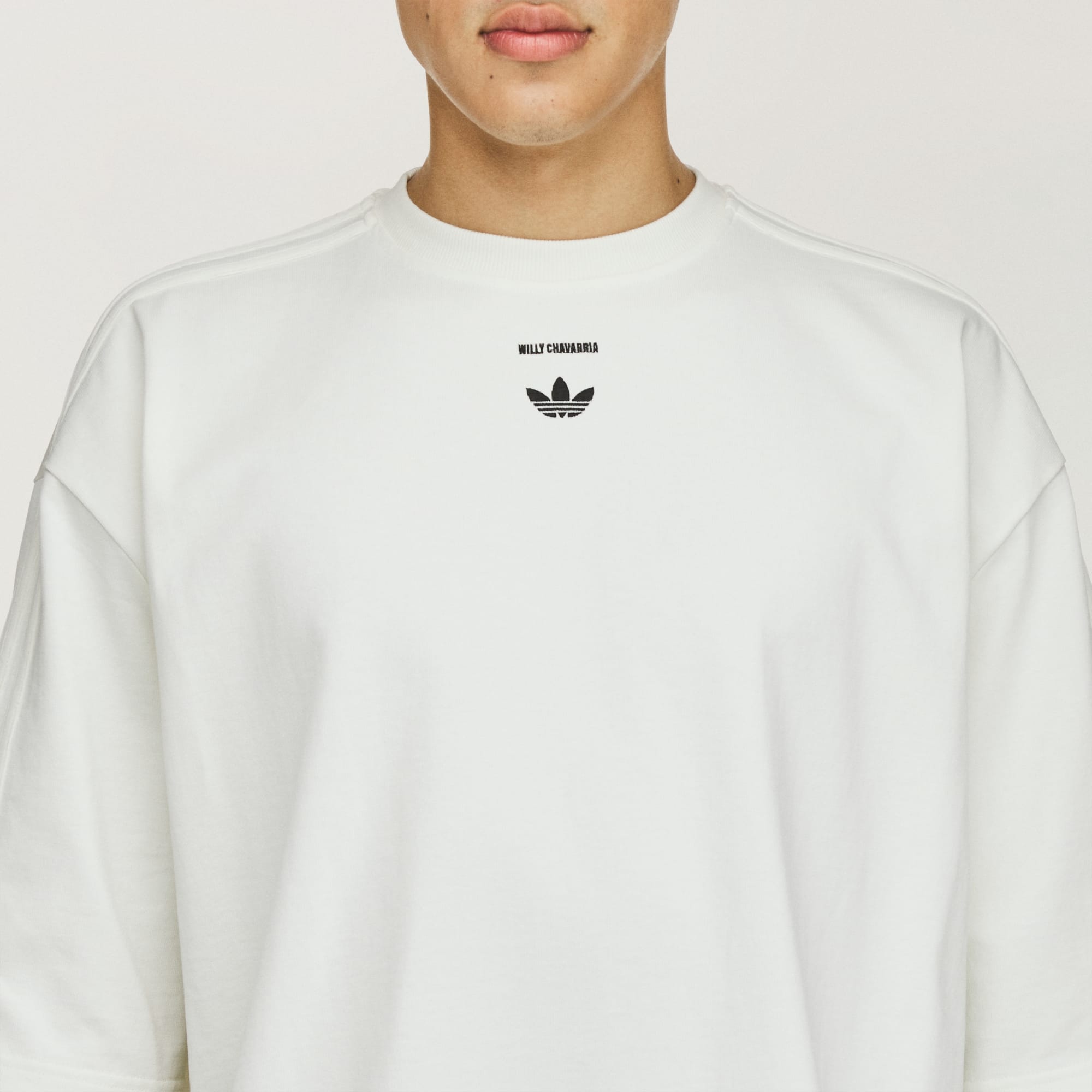 The Chavarria Signature Tee is elevated in a heavyweight jersey fabric to provide maximum comfort and wearability. The short sleeve tee is designed with voluminous proportions in the body. Functional details include a ribbed collar. Branding is symbolized by a printed trefoil and Willy Chavarria wordmark printed on the center front, with an embroidered trefoil and Chavarria wordmark placed on the back. Adidas applied 3 stripes run down both sleeves.