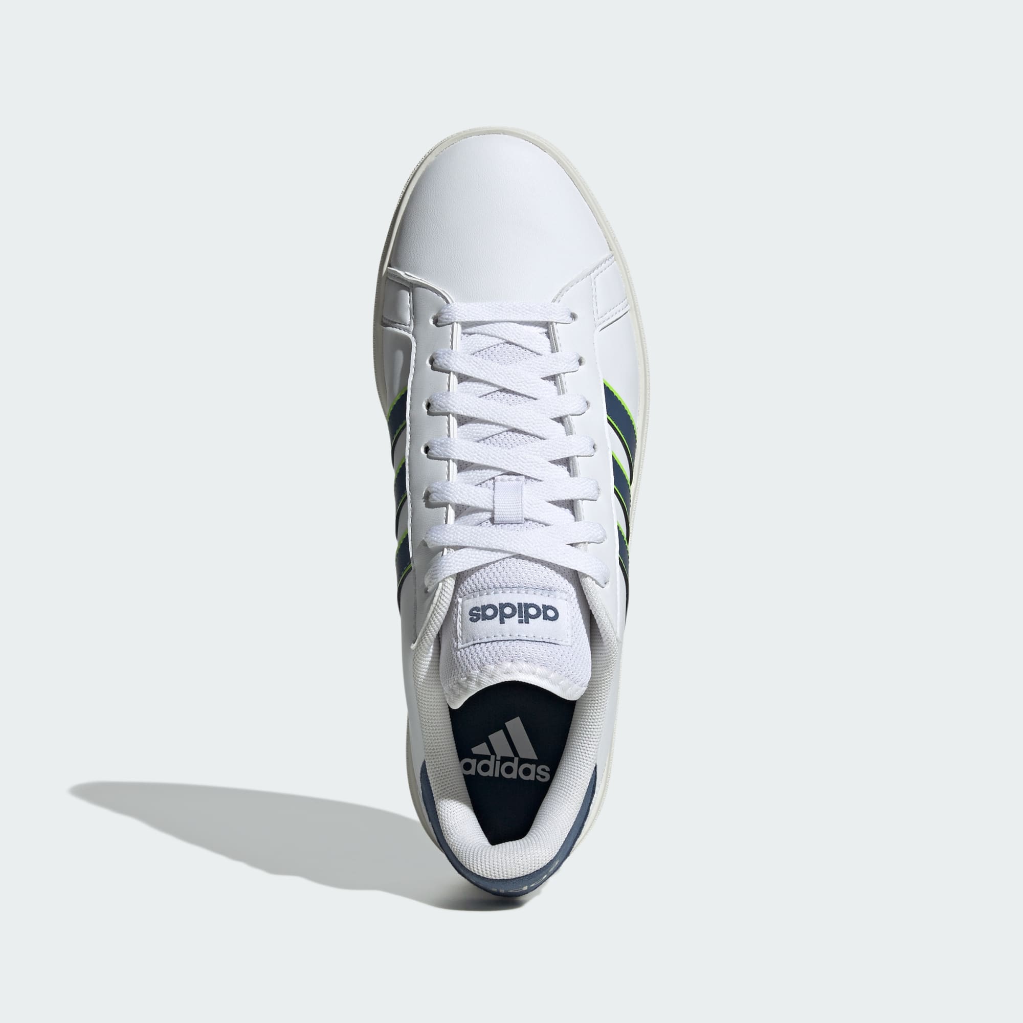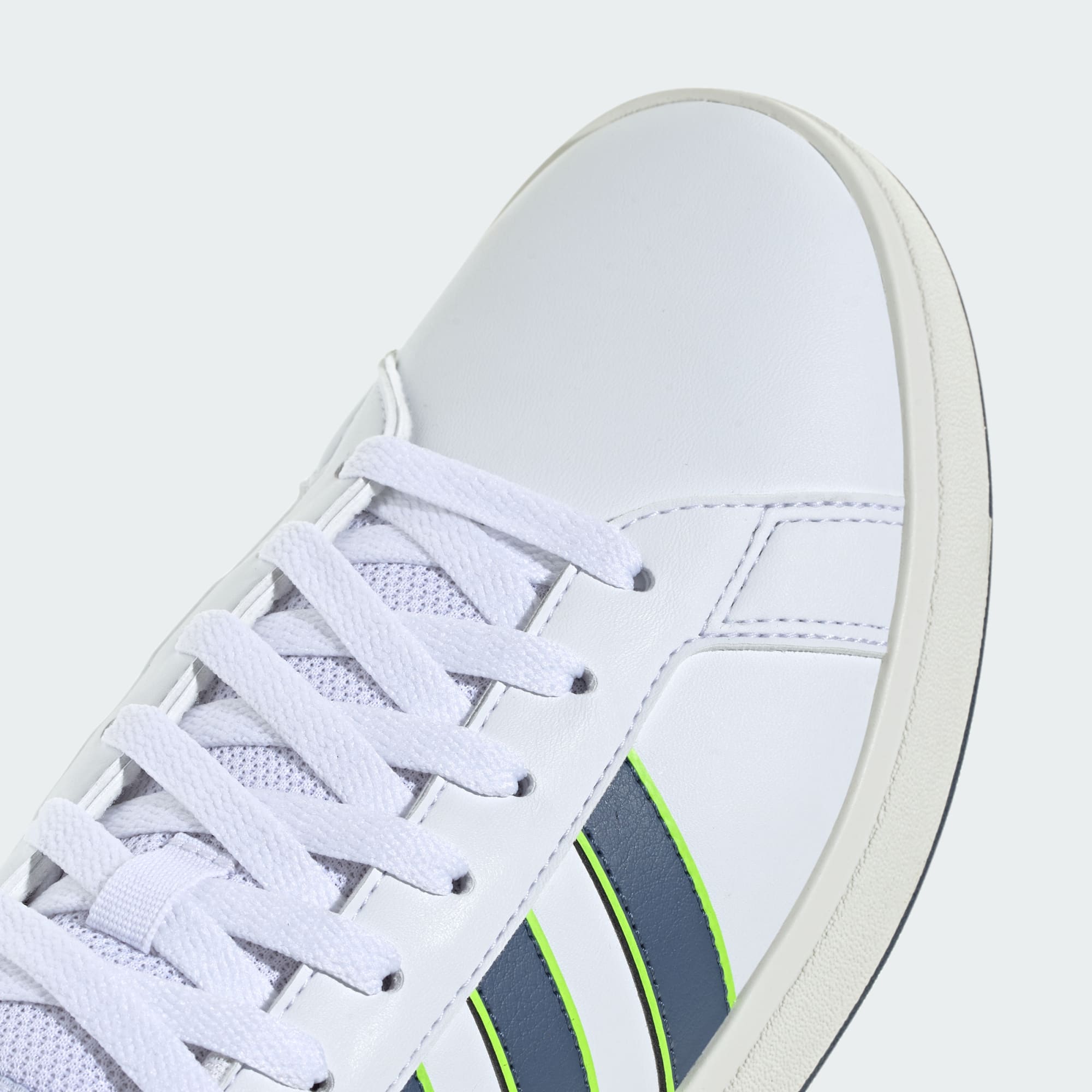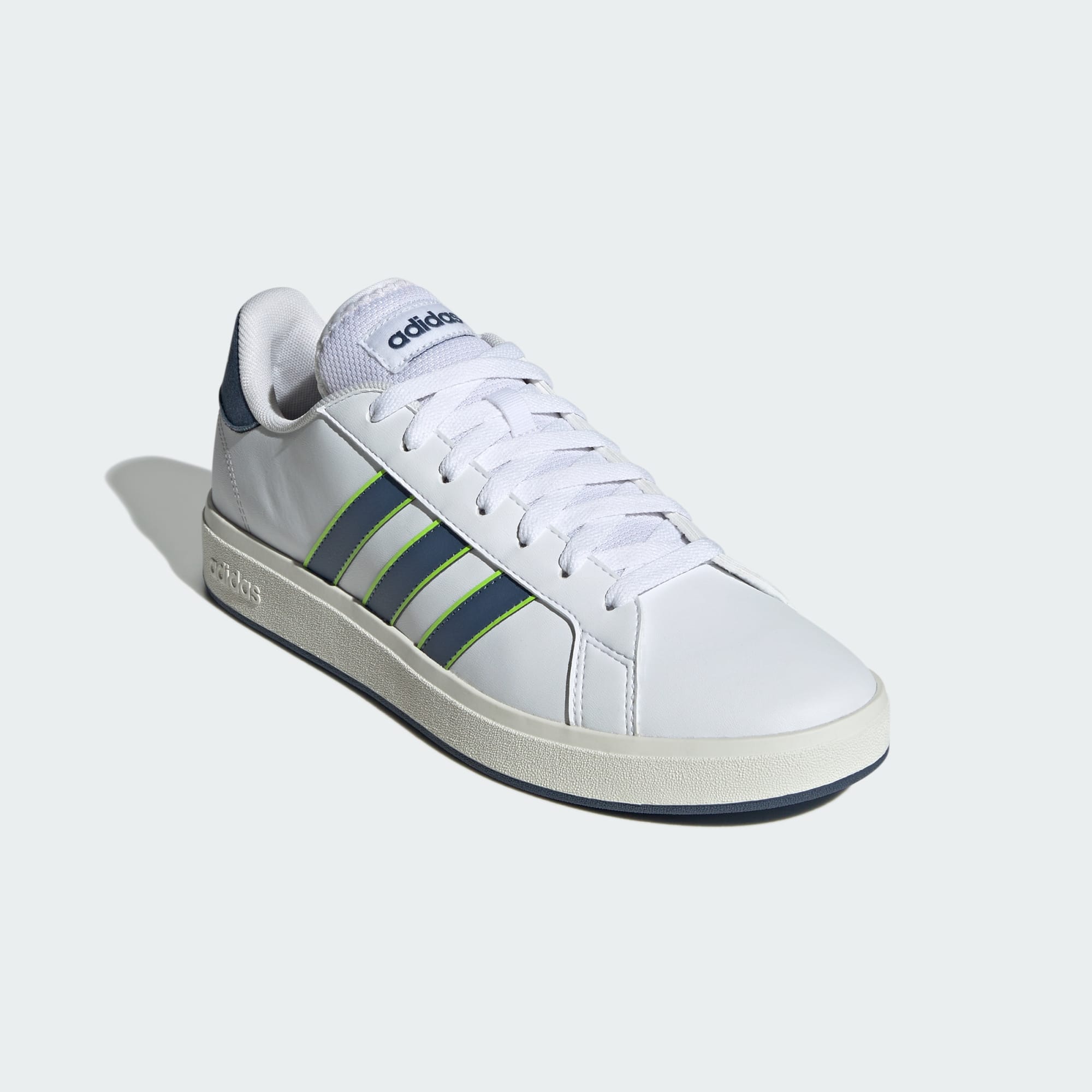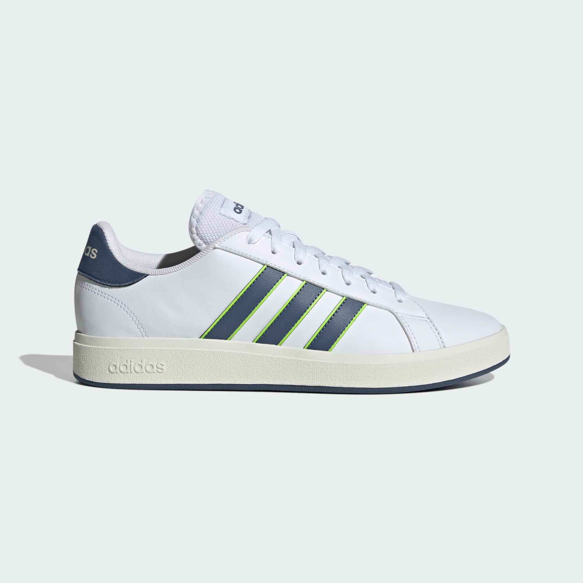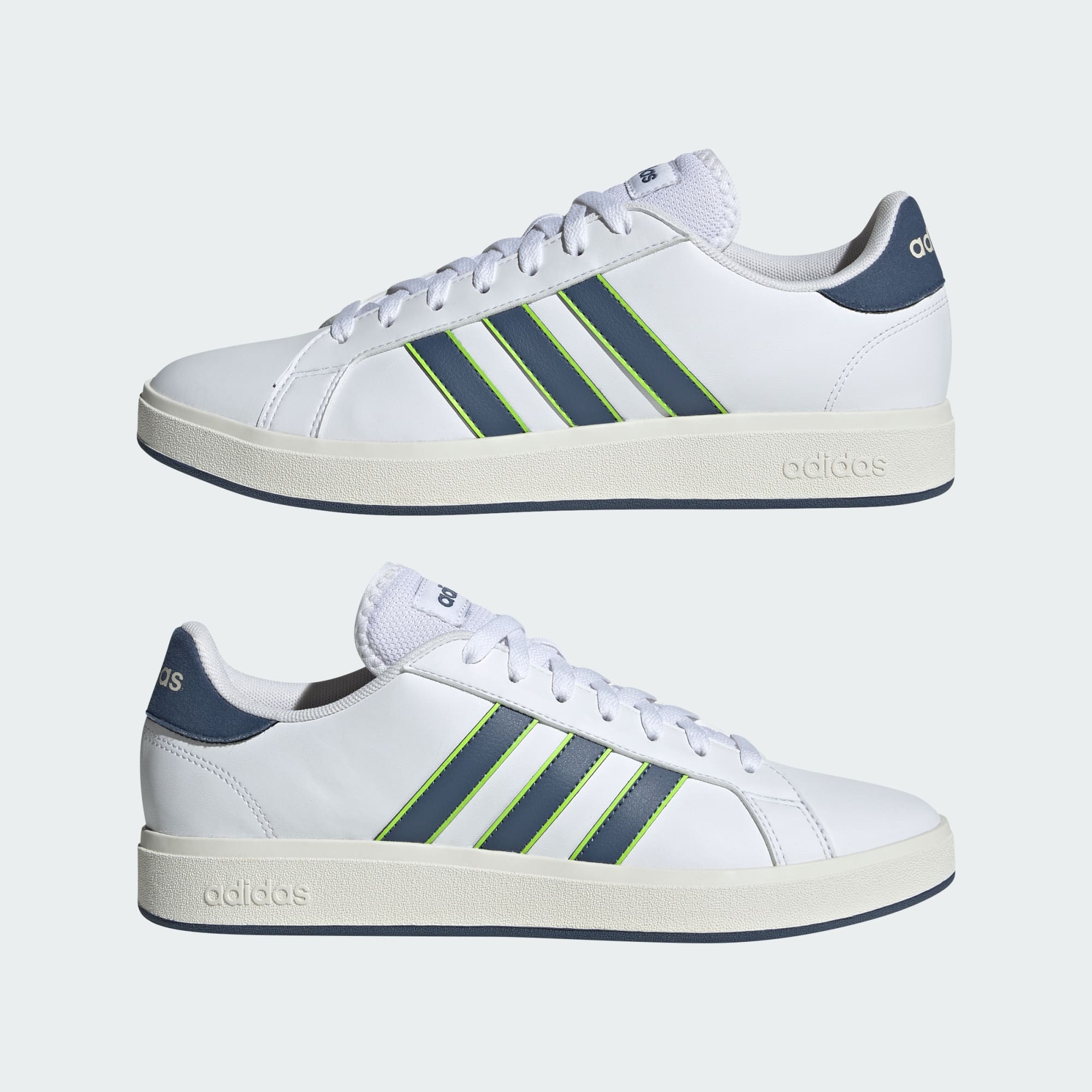 It's time to build — or fill in the gaps — in your retro sneaker collection. Let's start with these Grand Court shoes. The designers have revisited every element, adding a sturdy cupsole that offers grip in the wettest weather. Of course, these shoes stay true to their adidas roots too. The smooth, synthetic leather upper lets everyone know you're Team 3-Stripes.
