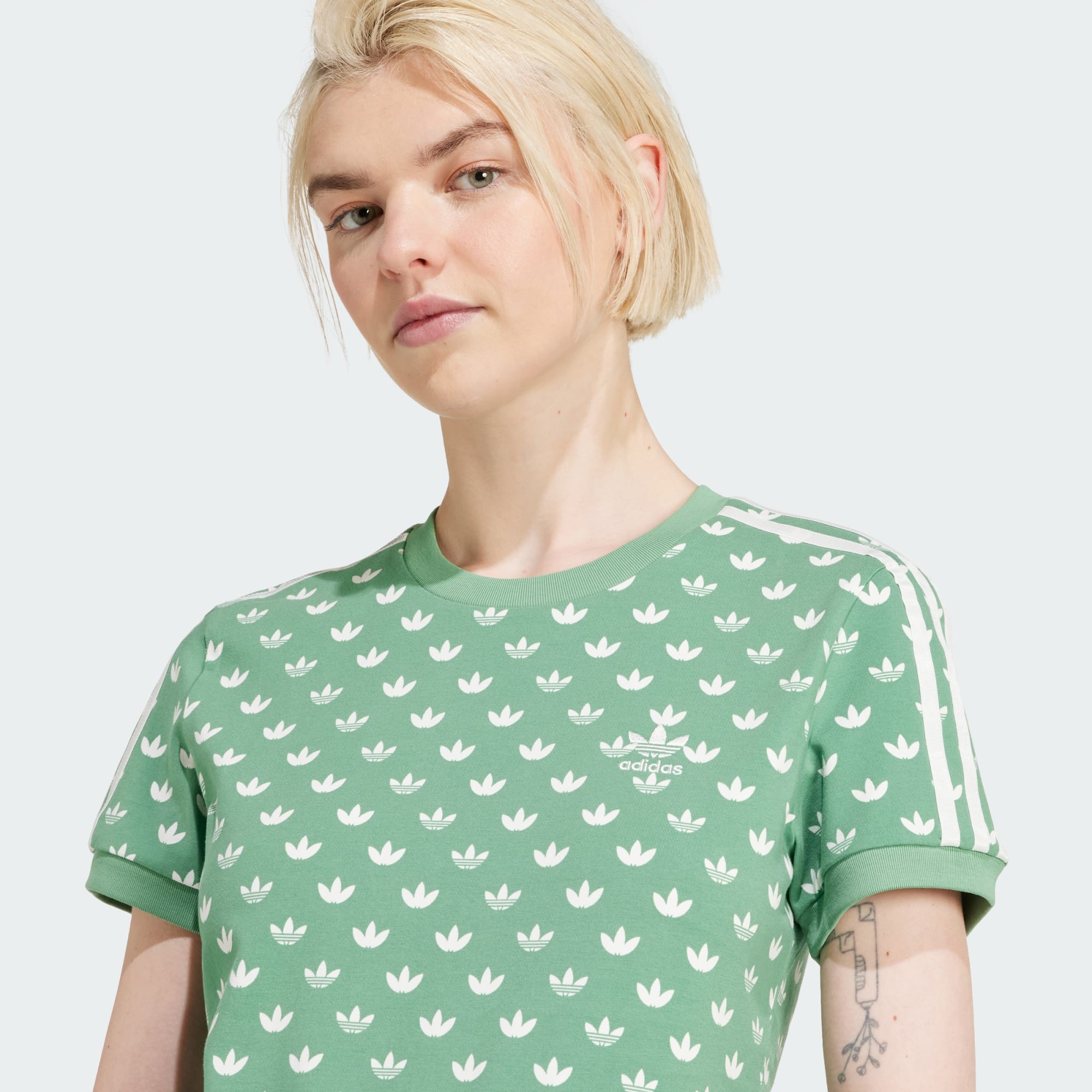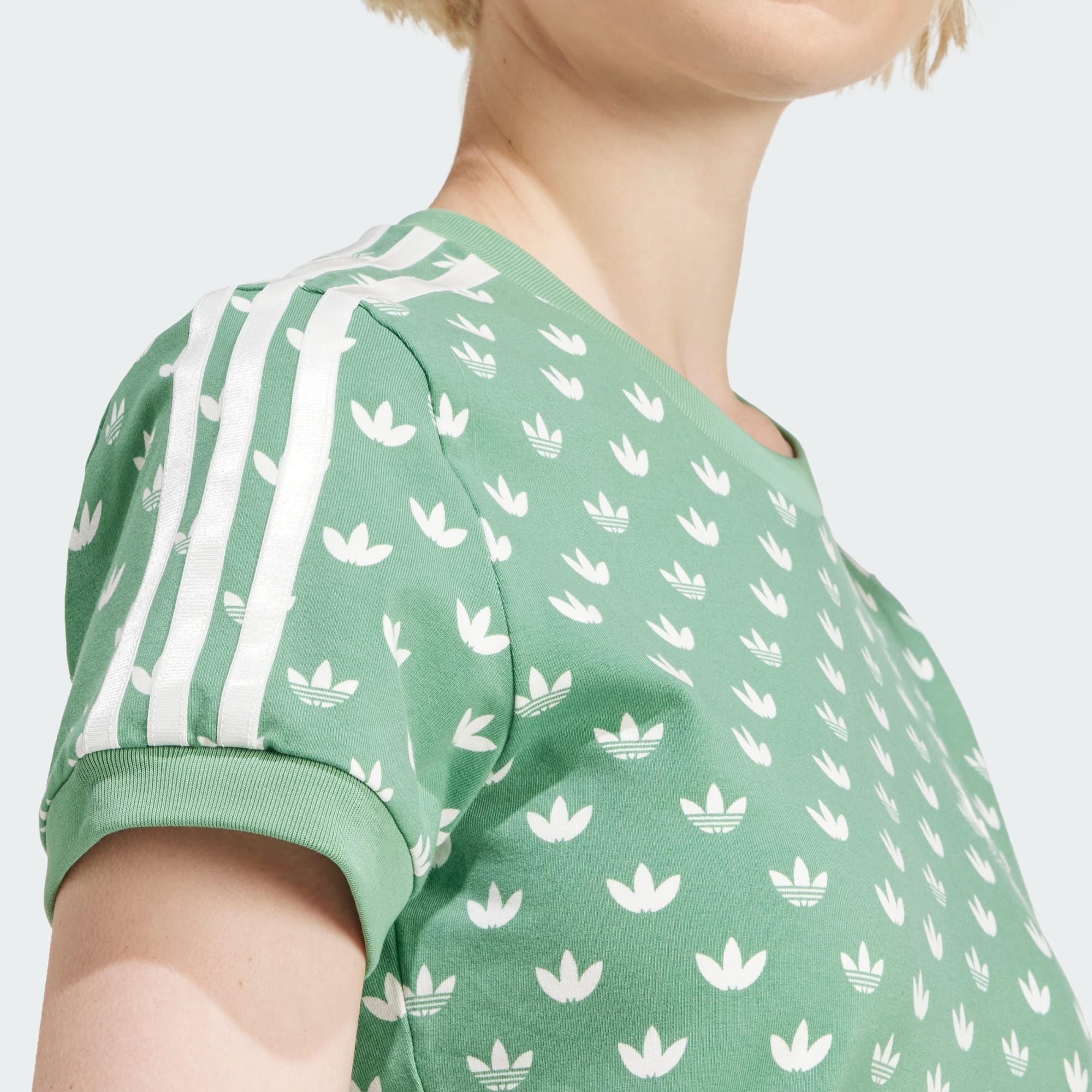 Make a statement with this reimagined classic. Updated in a '70s-inspired motif, this monogram adidas tee allows your everyday style to stand out. The slim, body-hugging fit celebrates your natural curves, and is made even more comfortable with ribbed details. Sporty yet luxe, this tee lets your style speak for itself. By choosing recycled, we are able to reuse materials that have already been created, which helps to reduce waste. Renewable materials choices will help us to remove our reliance on finite resources. Our products made with a blend of recycled and renewable materials feature at least 70% total of these materials.