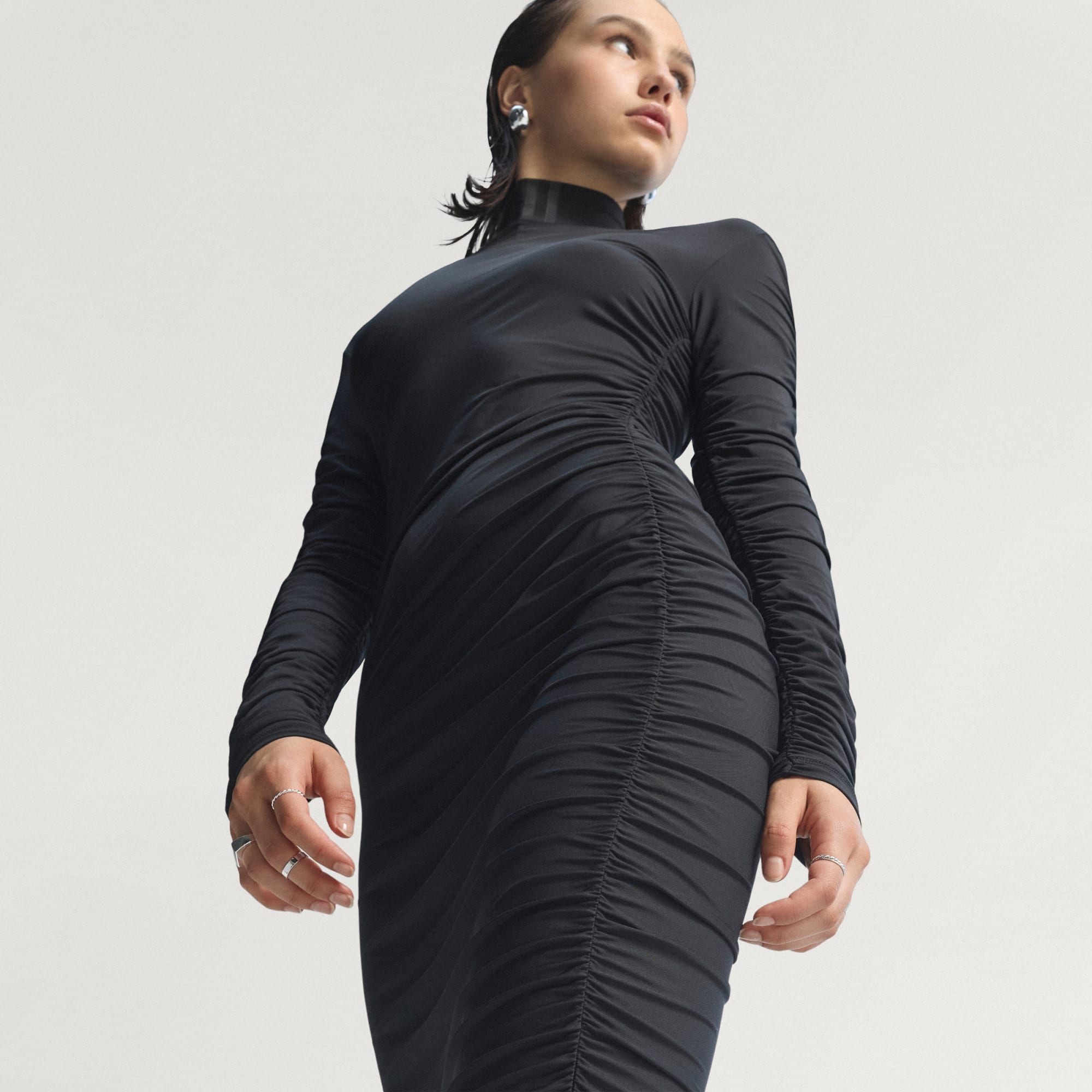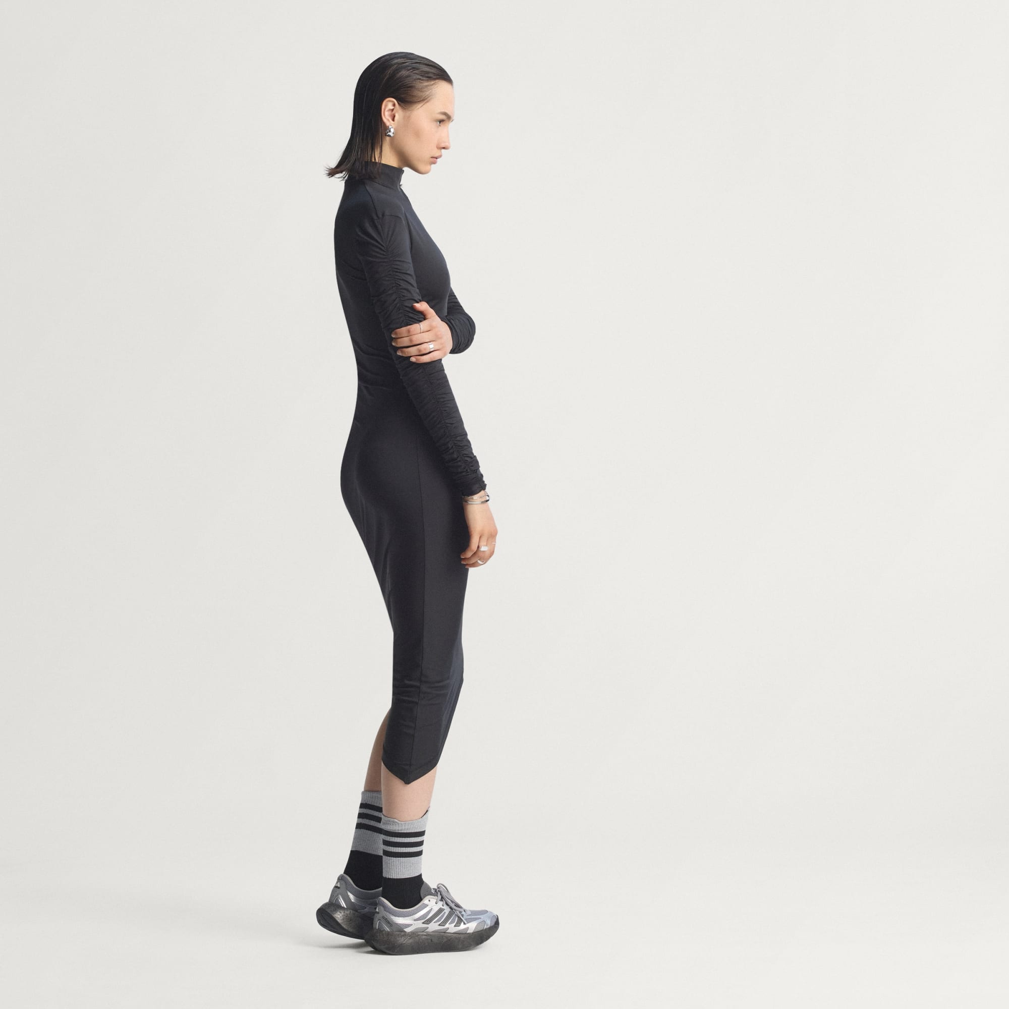This ruched maxi dress from adidas elevates your style, blending performance inspiration with clubbing culture. The slim fit hugs your body and the soft single jersey keeps you comfortable so you can own the night. Metallic materials and trims add fashion-forward detailing.