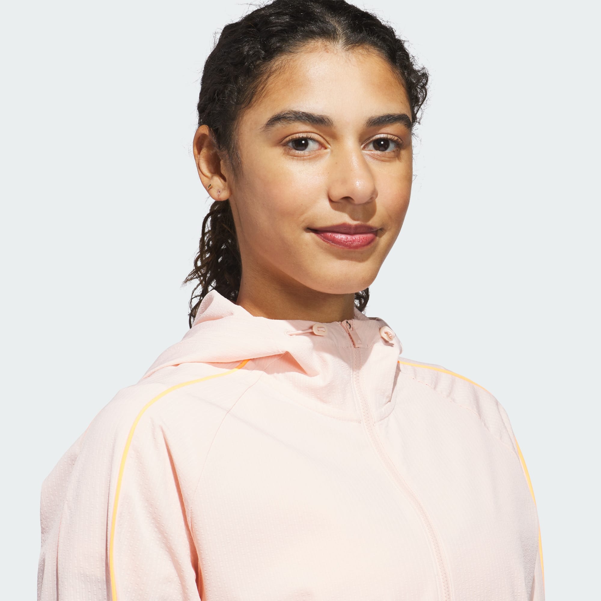 Lightweight golf jacket with loose fit and snug hood for warmth.